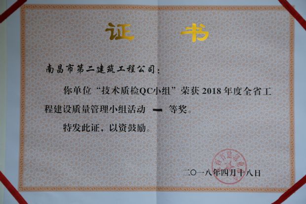 昨日,在全省QC成果发布会上,公司技术质检QC小组荣获2018年度全省工程建设质量管理小组活动一等奖。