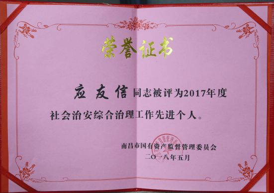 公司社会治安综合治理和信访工作荣获国资委2017年度先进单位,陈国明、应友信同志荣获国资委2017年度先进个人称号。
