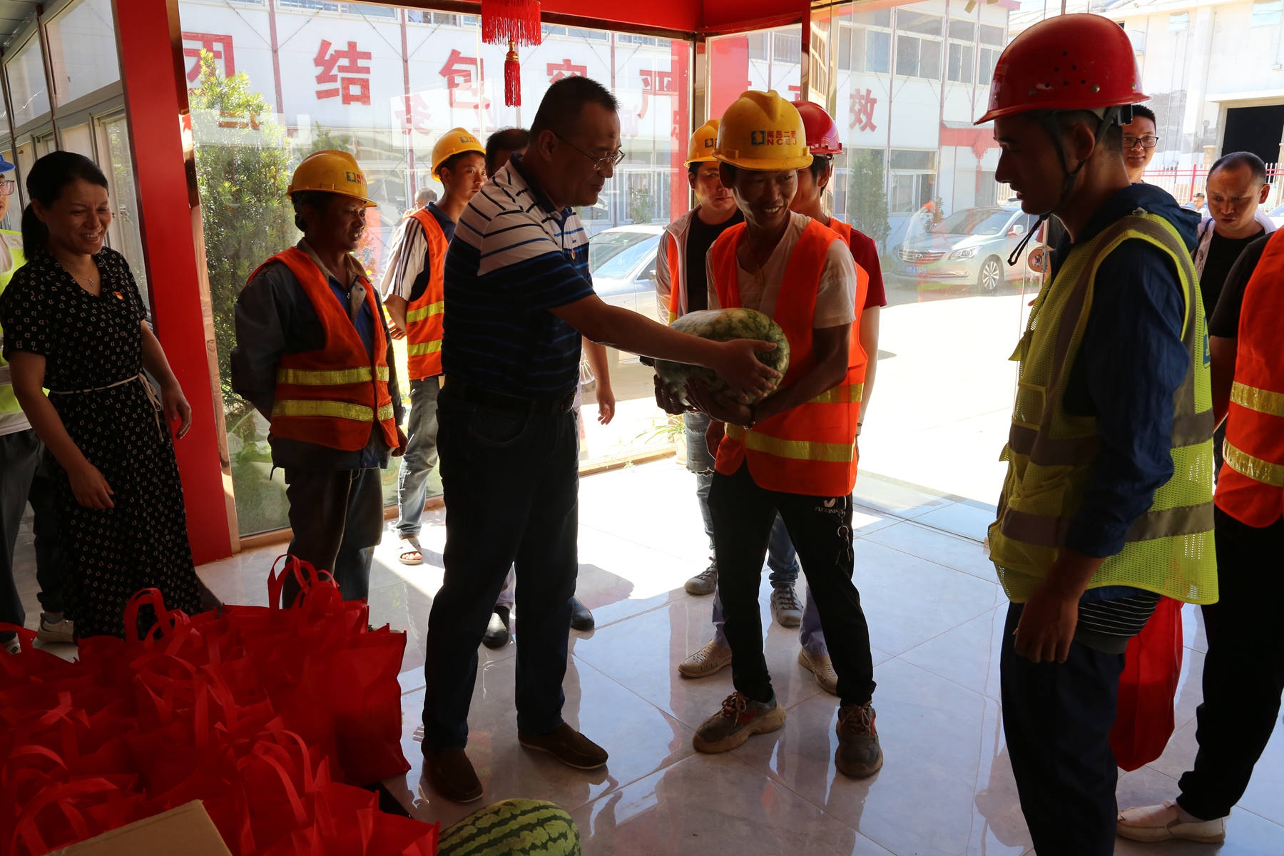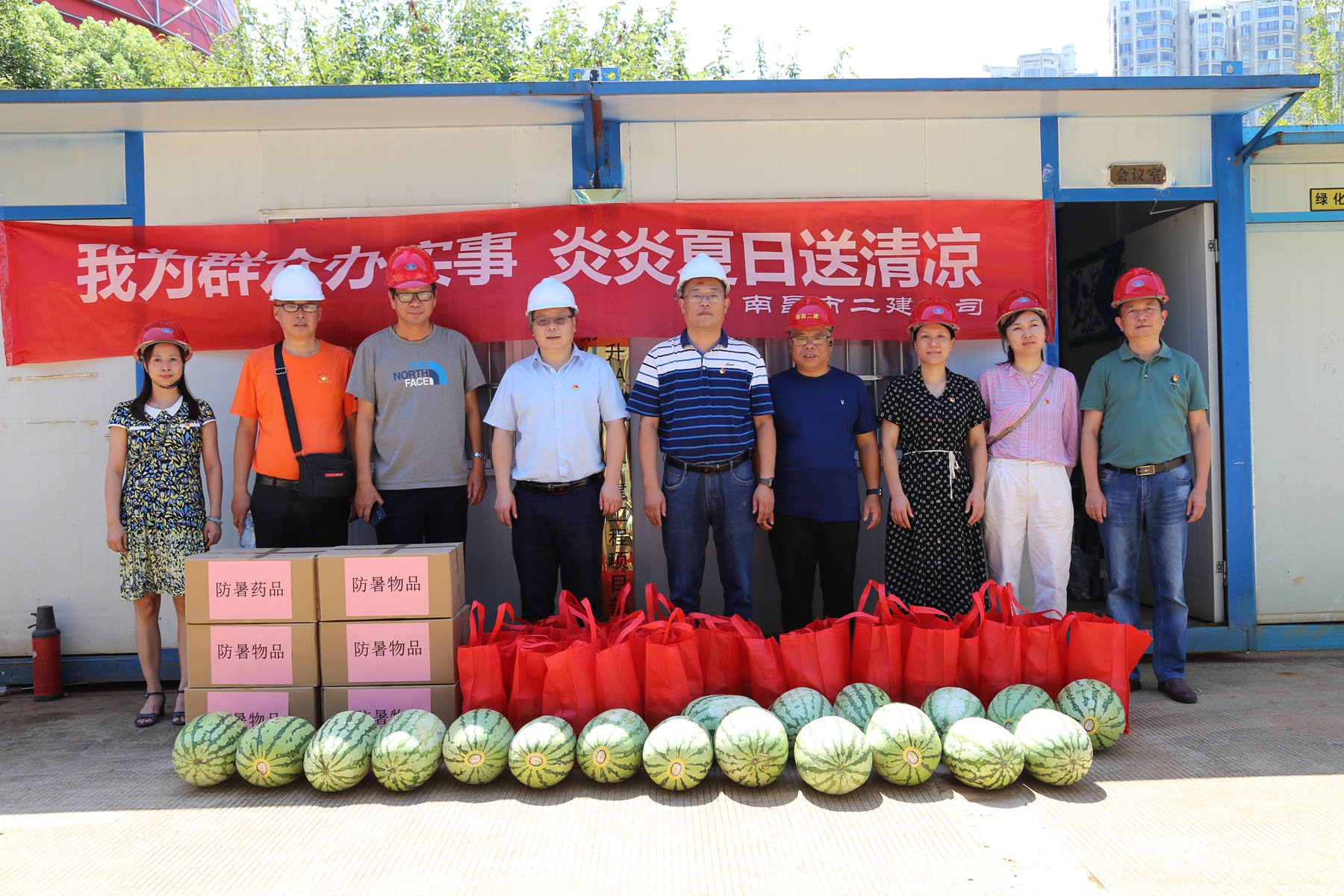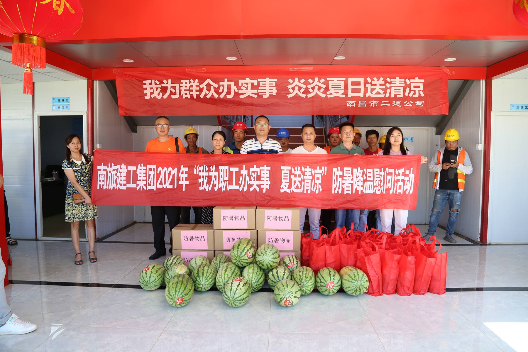 烈日炎炎,持续高温。为了给奋战在工程一线的广大员工带去企业的关怀,7月22日,公司相关部门在南旅建工集团总经理、公司党委书记、董事长王彦,南旅建工集团党委副书记、常务副总经理龚戬,公司纪检书记王小华、工会主席付蓉等领导率领下,先后来到“绳金塔民俗风情街”工程项目部、“滕王阁南扩”项目部及“南昌市第六粮库易址重建”工程项目部,开展“我为群众办实事 炎炎夏日送清凉”活动。每至一处,送上大批西瓜、绿豆、冰糖等防暑物品及药品,并询问项目部防暑降温工作落实情况,督促项目部把工程建设与职工健康安全同时抓牢实,确保项目建设正常推进。