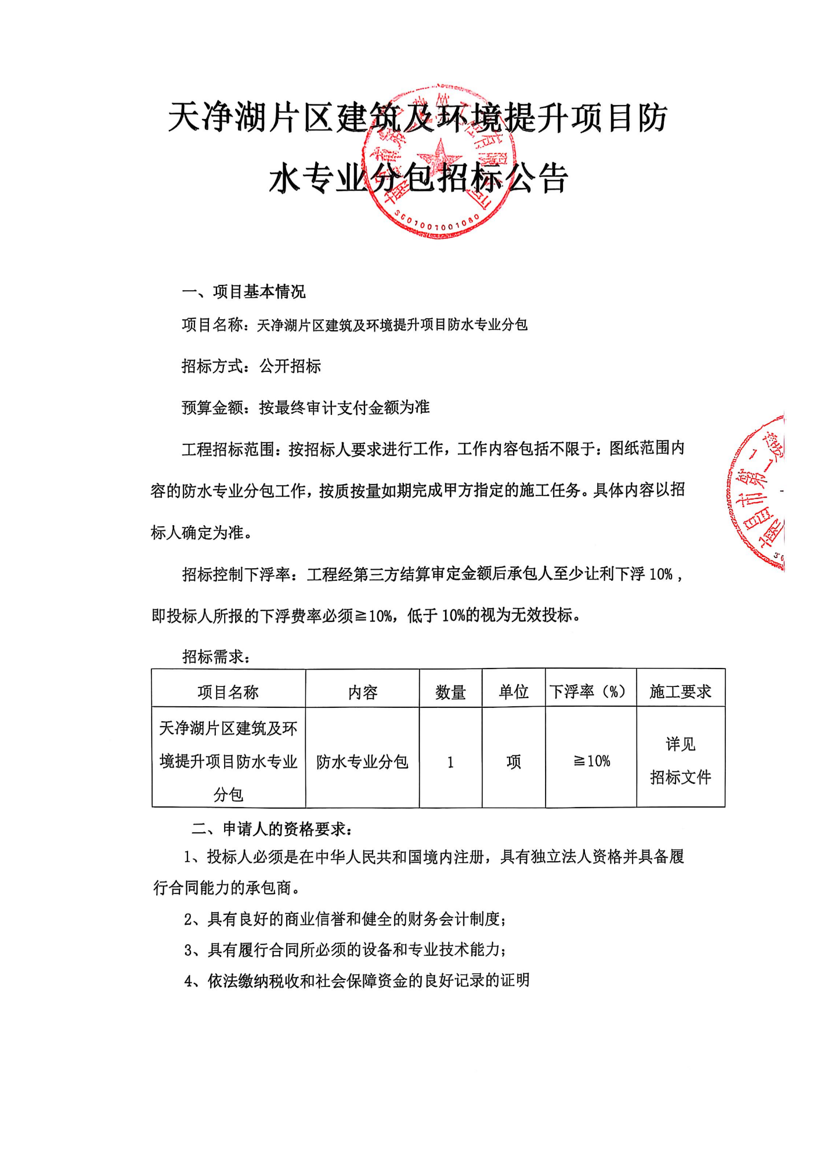 天净湖片区建筑及环境提升项目防水专业分包招标公告