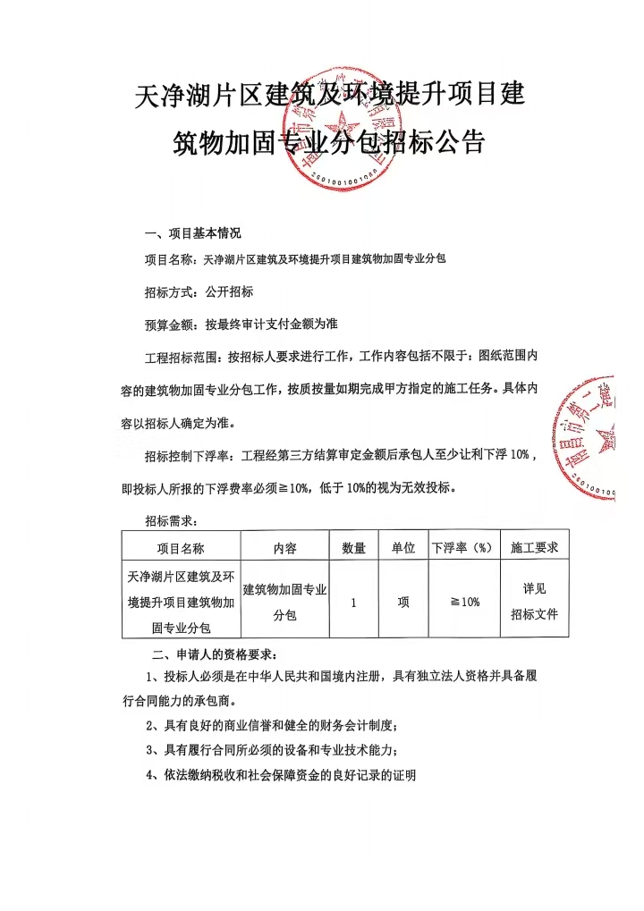 天净湖片区建筑及环境提升项目建筑物加固专业分包招标公告